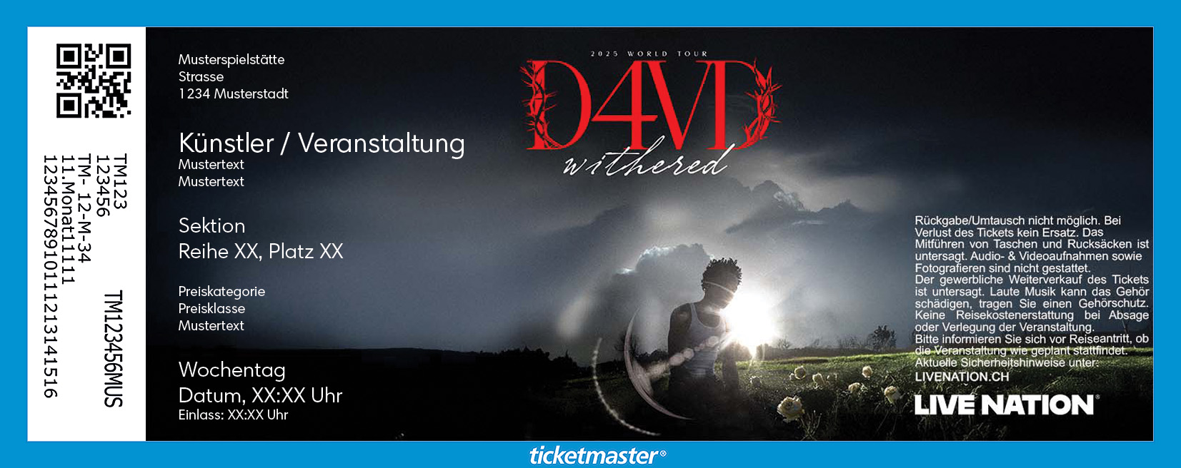 d4vd Withered 2025 World Tour Support: Saga Faye Türöffnung: 19:00 Uhr Beginn: 20:00 Uhr Ende: ca. 22:45 Uhr
